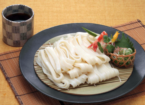 宮きしめんの半生麺は、短く切りだした麺を棒につるす「島田作り製法」により、小麦粉に含まれるうまみ成分を麺全体にいきわたらせており、ふっくらとした弾力のある歯ごたえと厚みのあるもっちり感をお楽しみになれます。