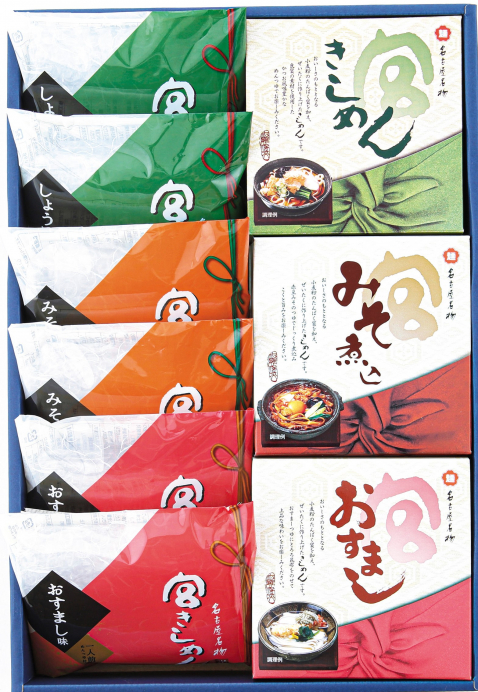 半生麺シリーズ「宮きしめん結」と、最上質の乾麺「宮きしめん伊兵衛」を詰め合わせました。もっちりとした半生麺と、なめらかな舌ざわりの乾麺、それぞれの麺の食感をお楽しみください。