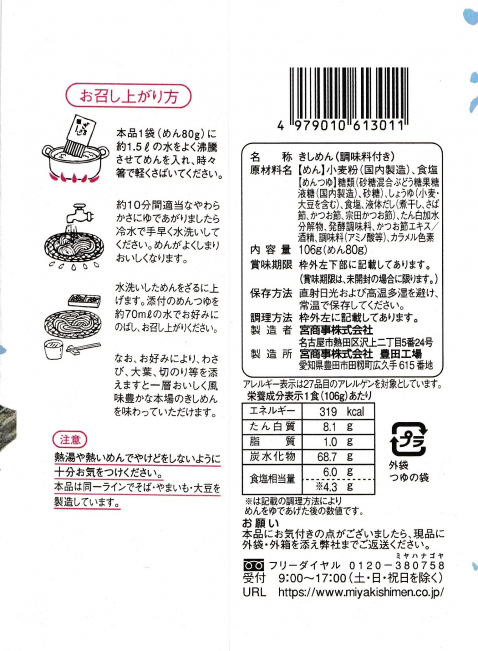 宮きしめんが日本で初めて技術開発した折りたたみ式乾麺は、麺の中に小麦粉のうまみがたっぷり含まれています。