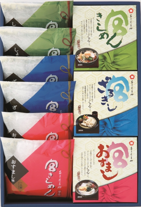 かつお風味の定番しょうゆ味と、夏限定の涼味ざるきしめん、白だしつゆの上品なおすまし味の三種類の味の詰合です。